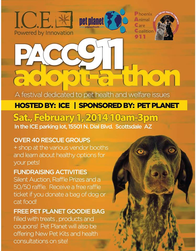 See our events calendar here. Current Scheduled Events: PACC911 I.C.E Adopt-a-thon Event Saturday February 1st, 2014 10:00 AM until 03:00 PM Location: PACC911/I.C.E. Map: 15501 N. Dial Blvd Scottsdale AZ 85260 Please come out and meet some of our adoptable dogs!
