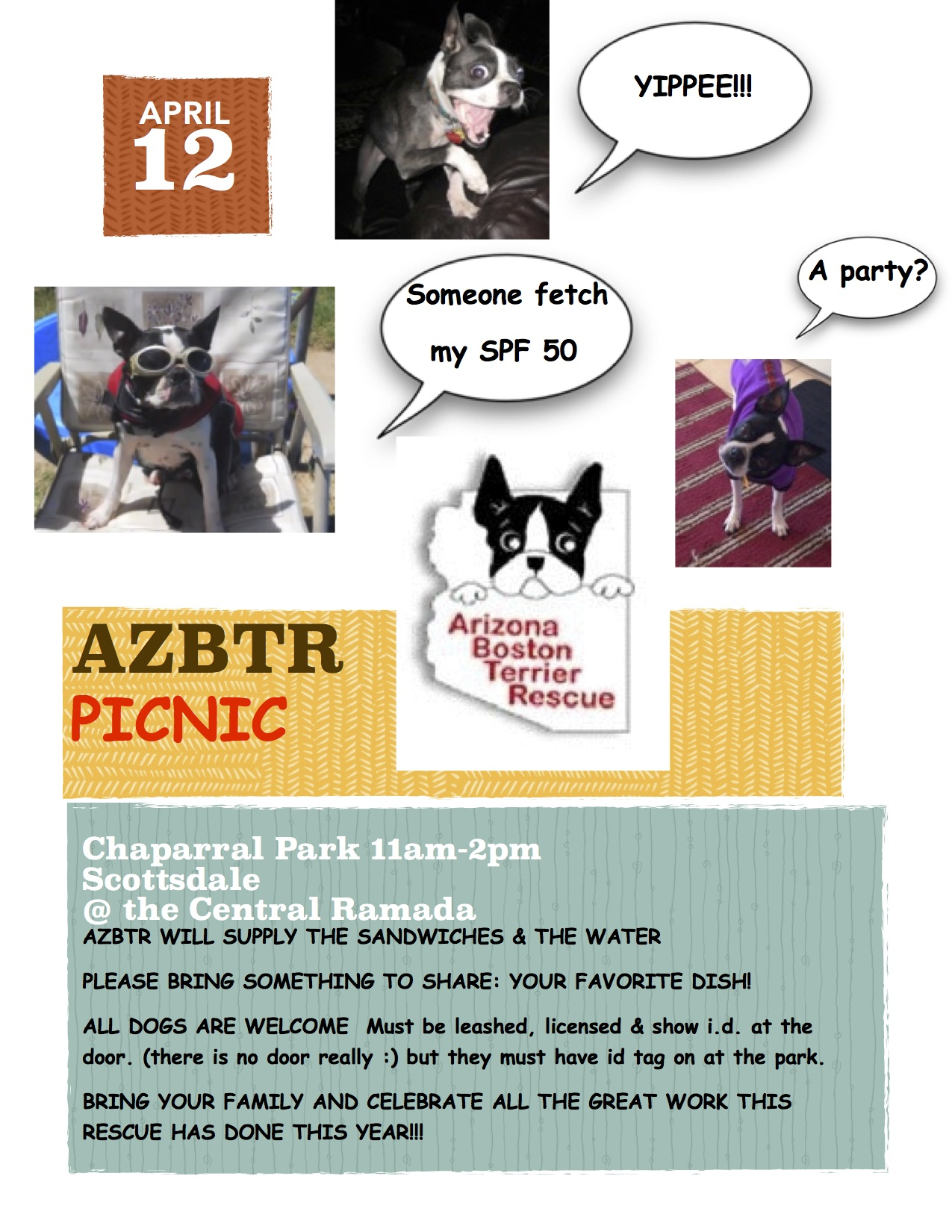 Come share in the fun and frenzy with the Arizona Boston Terrier Rescue at our spring picnic fundraising event! There will be refreshments, photo opportunities, raffle prizes*, and undoubtedly tons of Boston Terrier tomfoolery! AZBTR is providing s andwiches, but please feel free to bring a side to compliment and share such as chips, salads, fruits, drinks, etc.