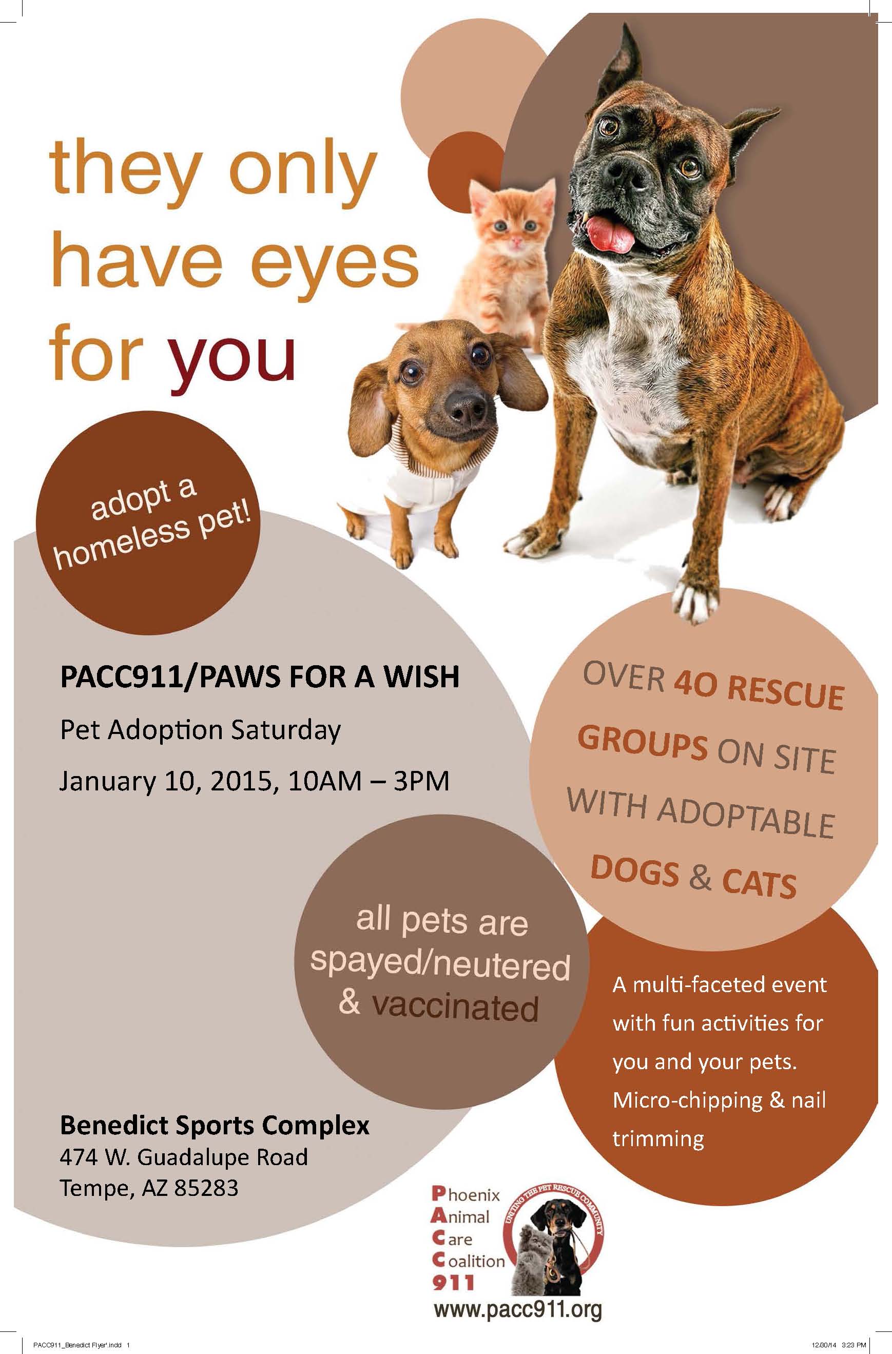 See our events calendar here. Current Scheduled Events: Paws for a Wish Saturday January 10th, 2015 10:00 AM until 03:00 PM Location: Benedict Sports Complex Map: 490 W Guadalupe Rd Tempe AZ 85283 Have you heard??!! Paws For A Wish, the only Dog Sporting Event of it's kind returns to Phoenix January 9-11, 2015! Word at the dog park is your dog wants to have some FUN. Bring them out try the National Canine Cancer Foundation Lure for a Cure course presented by Blue Buffalo. Think they will have the fastest time of the weekend? Take home a furry bundle of joy from our new PACC911 Rescue Zone brought to you by Petco Foundation and featuring over 40 rescues! Down the dock and into the water, see how far your dog can jump with Arizona Dock Dogs! See what Agility is all about and how YOU can get involved by watching the Agility event Friday January 9th - Sunday January 11th.