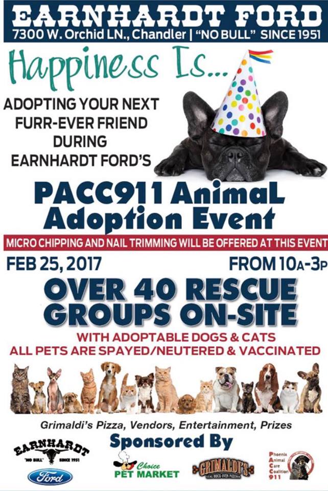 Phoenix Animal Care Coalition (PACC-911) adoptathon on Saturday, February 13, 2021 at Anthem Community Park from 10 am to 3 pm.; Arizona Boston Terrier Rescue will not be attending.