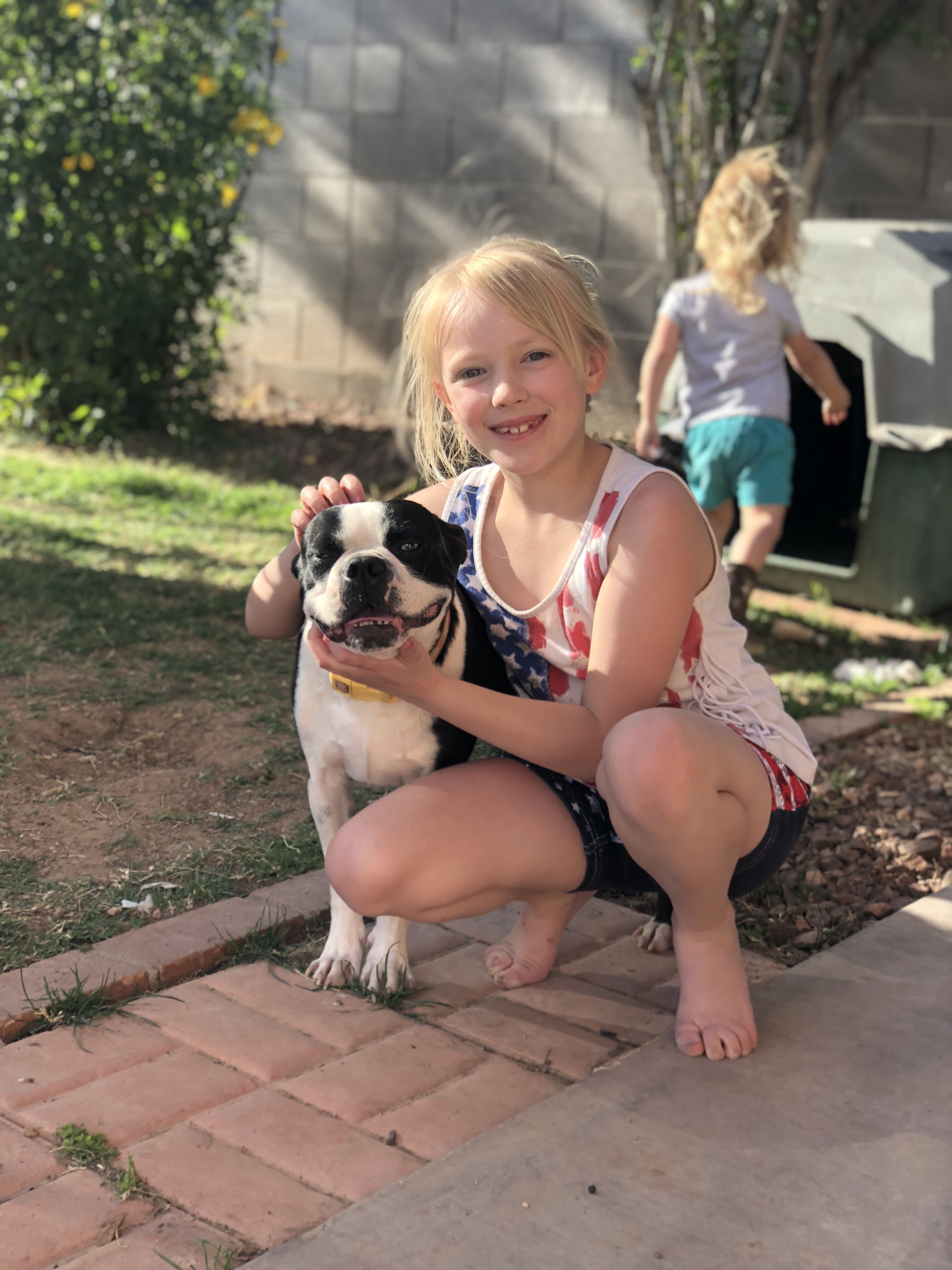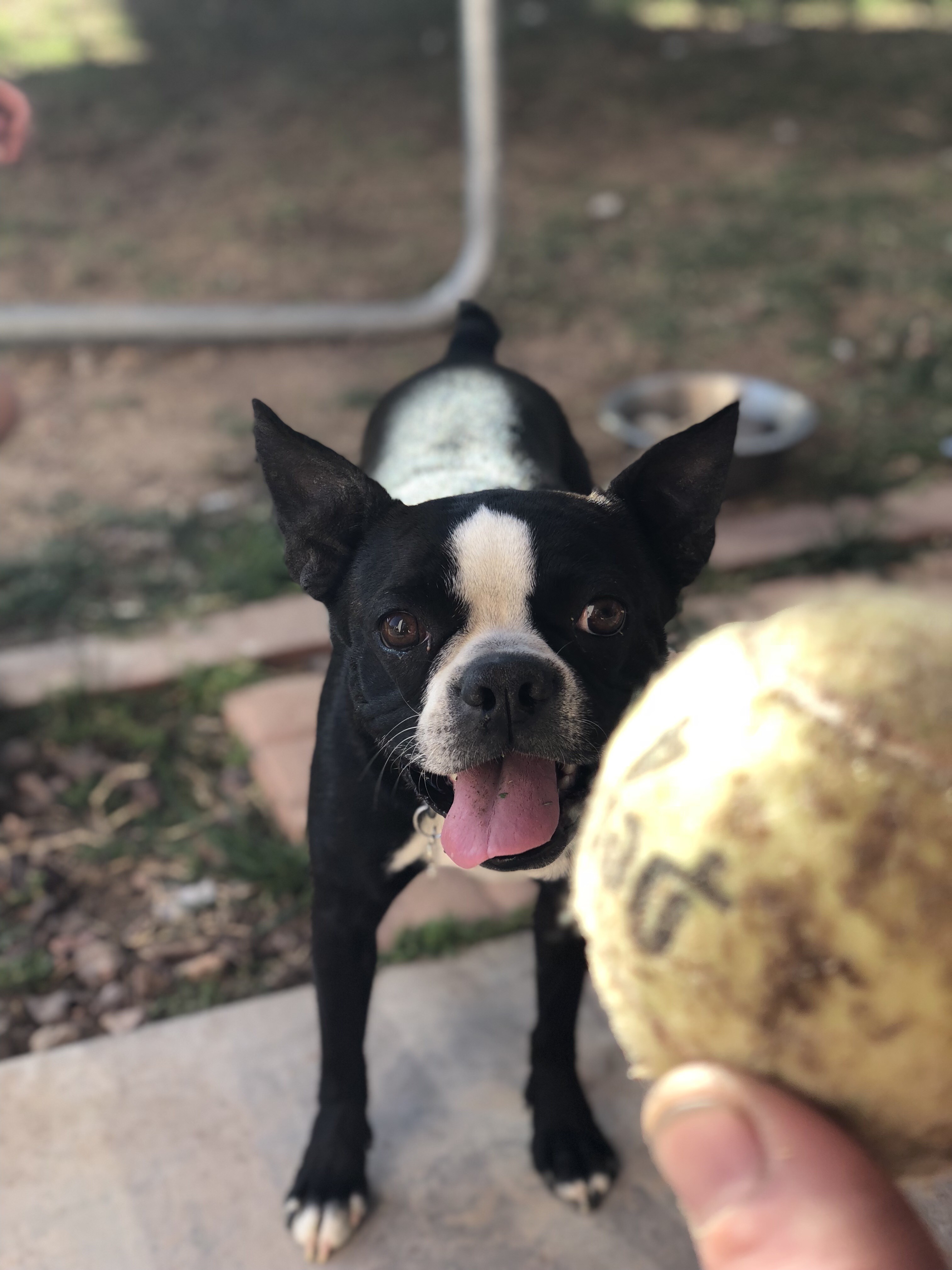 Minnie and Junior are two very loving and energetic Boston’s. They have been together for about two years since they were both around 2. They love to cuddle up together especially when it’s cold (to them anything below 65 degrees.) Minnie has some itchy skin and may require some medical care to treat it. Both dogs are potty trained and kennel trained however Minnie started marking after my two year old was born. I am sure this behavior can be handled with the right caretaker and extra attention Minnie needs and wants. Junior loves to jump up but he does not put much weight at all he just wants to have his cute little face rubbed. They both love to have the ball thrown; however, Minnie is the retriever 99% of the time and Junior plays along. Minnie also loves to swim and will jump in the pool onto a boogie board or even off the diving board. Junior likes the water but he is more of a “hold me and let me float” kind of dog. These two are the best of friends and need to stay together in a forever home. They are great with kids of all ages and even other dogs. Neither are territorial over food. Although they are kennel trained they would prefer to sleep in bed with you. Call or text Rachel at 480-760-1313 if you are interested in giving these Boston Terriers a home.